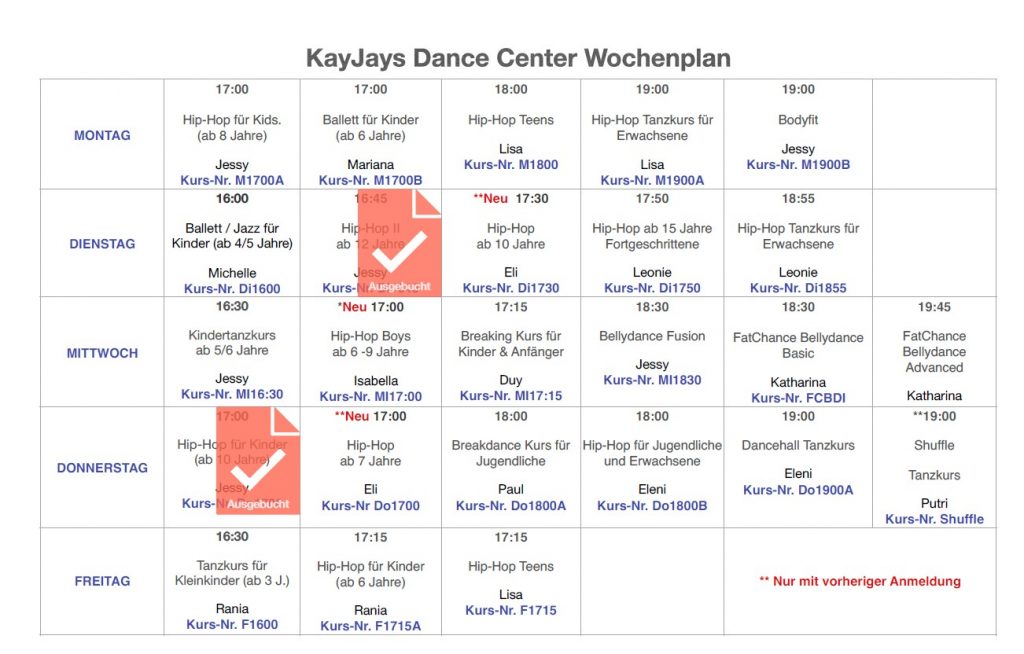 Plane deine Woche mit unserem Tanzstundenplan in München! Hier findest du alle aktuellen Kurse des KayJays Dance Center, übersichtlich nach Tagen, Uhrzeiten und Tanzstilen geordnet.